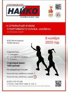 - III открытый Кубок СК “НайкО” по метанию ножейДата проведения: 8 ноября 2025 года